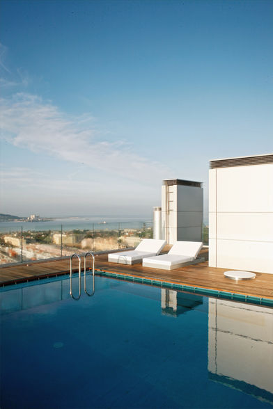The rooftop features a beautiful swimming pool and elegant lounge deck with cabana chairs, offering spectacular 360° views across Lisbon, the Tagus River, and the Atlantic Ocean.
